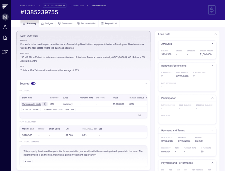 Fintive provides tools for credit and financial analysis, loan approval and review, collateral management, risk rating, covenant testing, and much more.